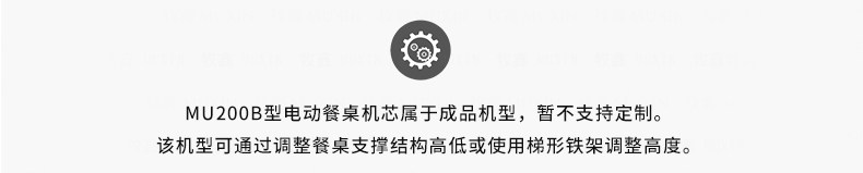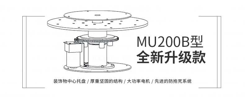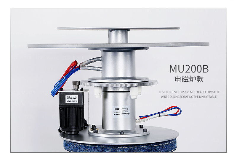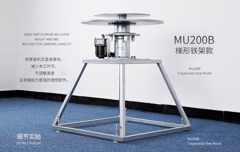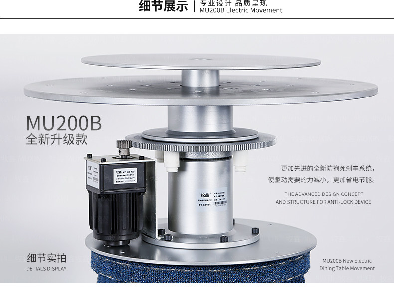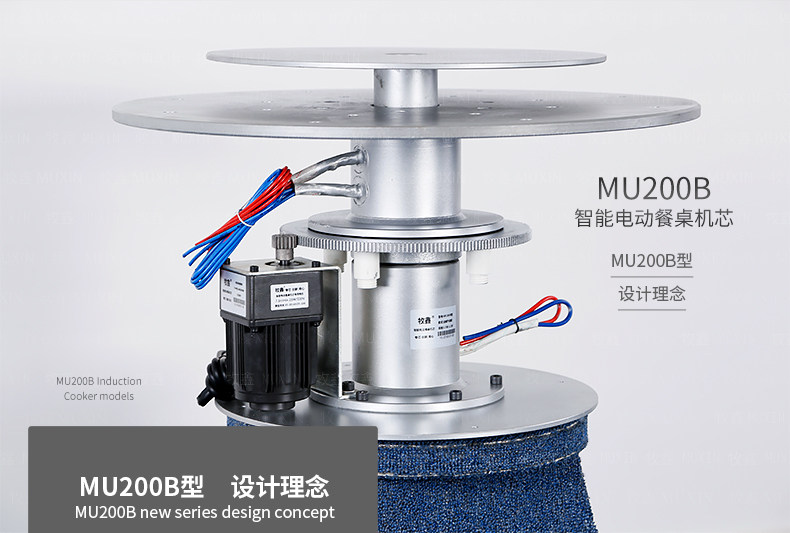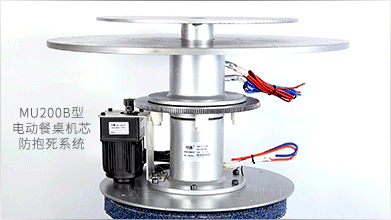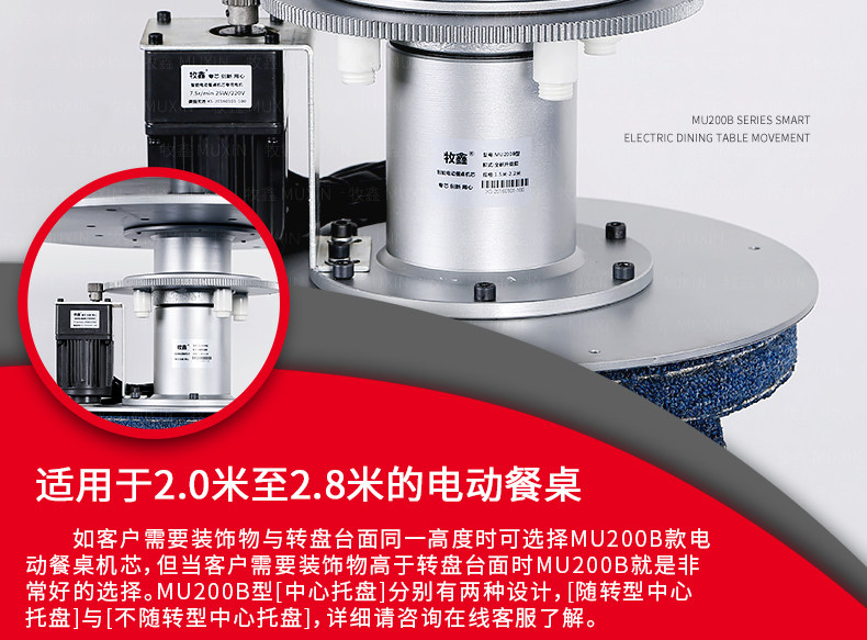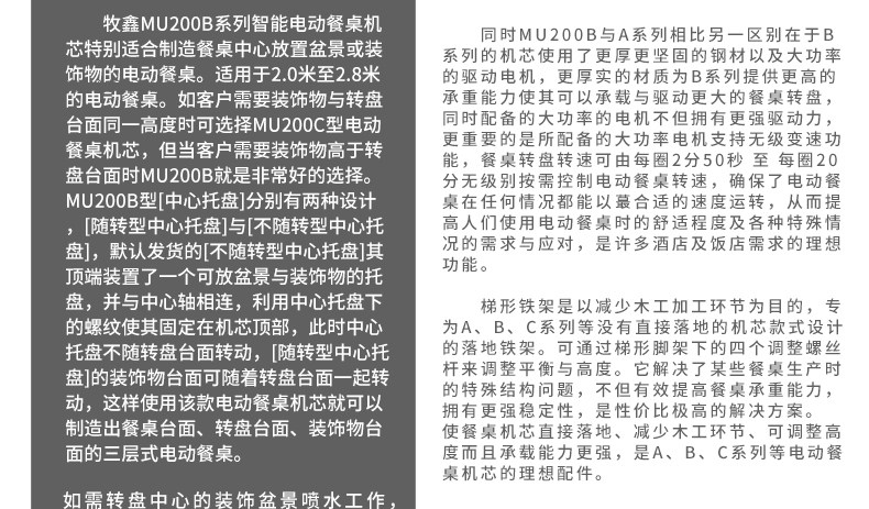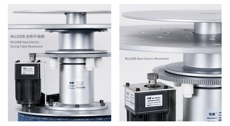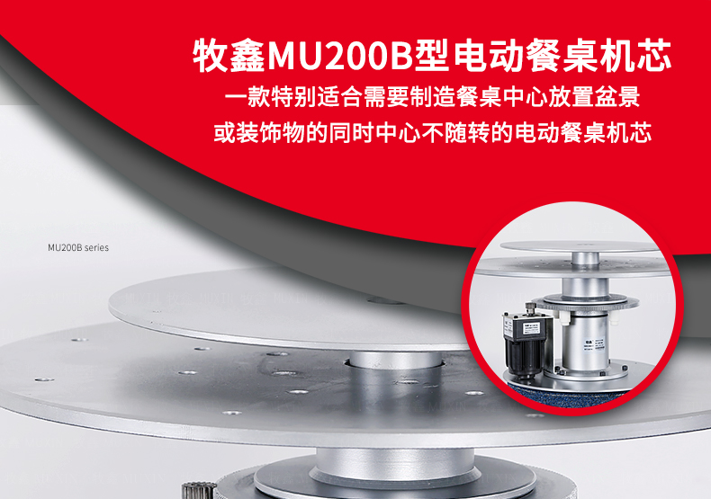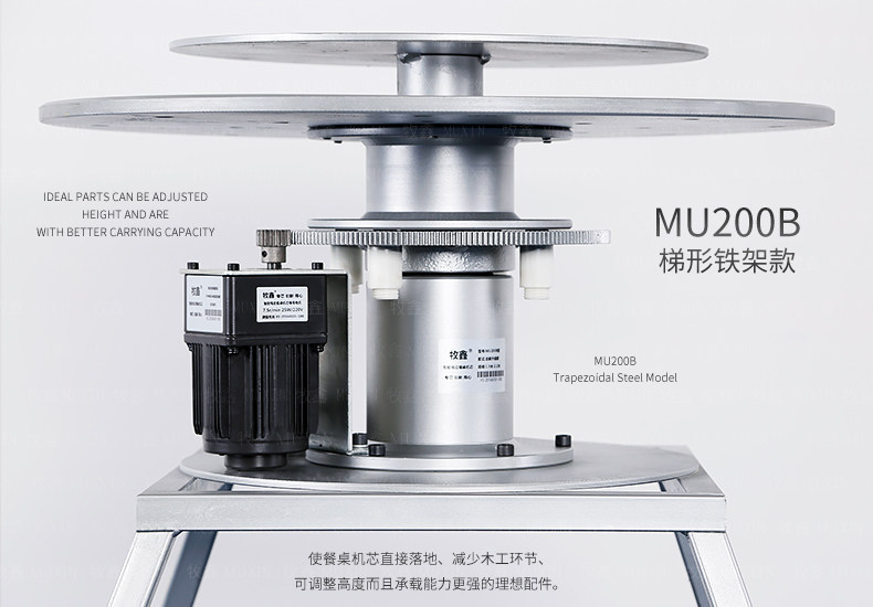牧鑫MU200B系列电动餐桌机芯,适合制造餐桌中芯放置盆景或装饰物的电动餐桌。适用于2.0米至2.8米的电动餐桌(直径为1米至1.8米的转盘)。与A系列相比B系列使用了更厚更坚固的机身结构、更大的齿轮盘以及大功率可调速驱动电机。[中芯托盘]分两种设计,默认为[不随转型中芯托盘]其顶端装置了一个可放盆景与装饰物的托盘,并与中芯轴相连,利用中芯托盘下的螺纹使其固定在机芯顶部,此时中芯托盘不随转盘转动,[随转型中芯托盘]的装饰物可随着转盘一起转动,该型号适合生产:餐桌台面、转盘台面、装饰物台面组成的三层式电动餐桌。