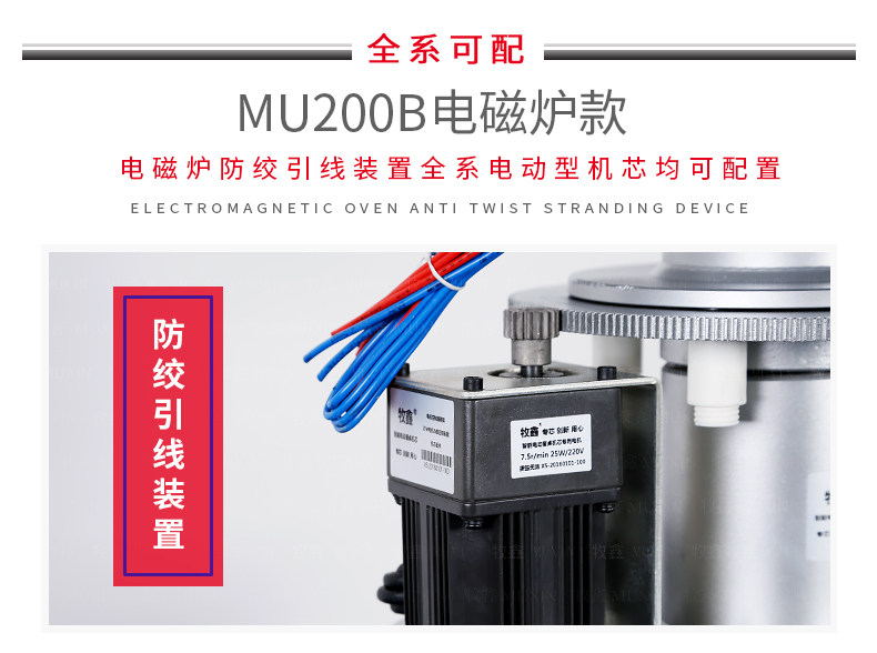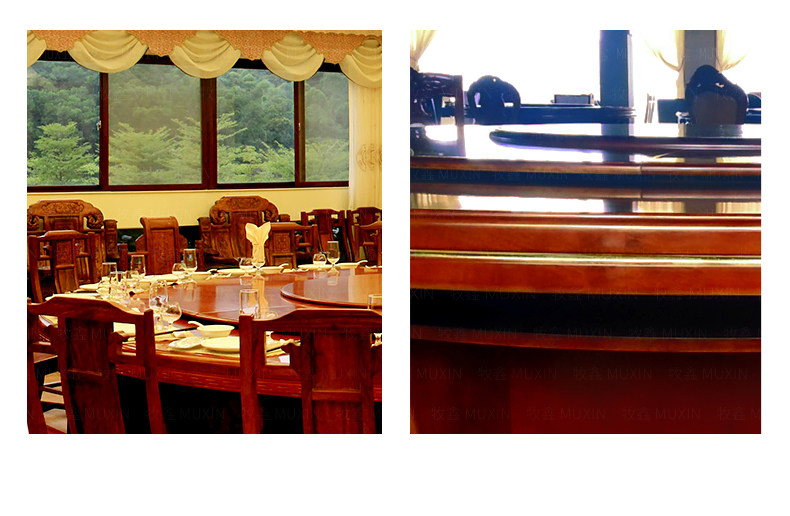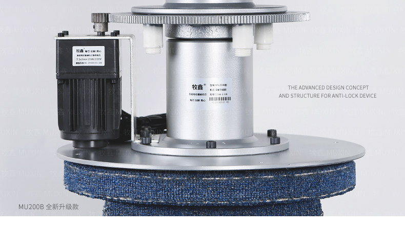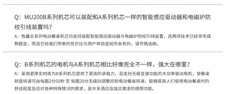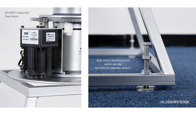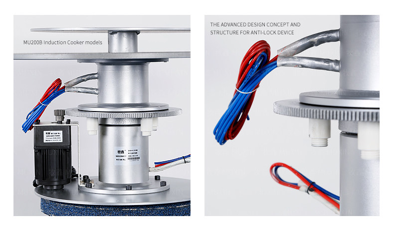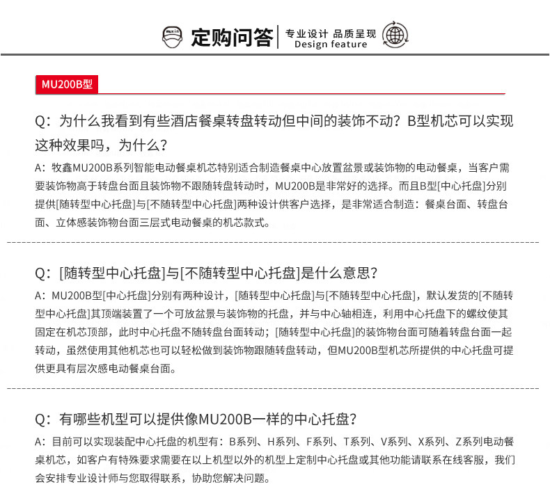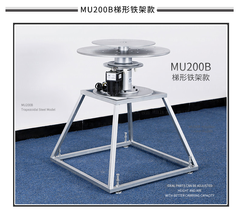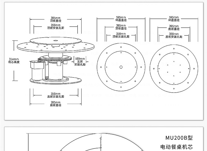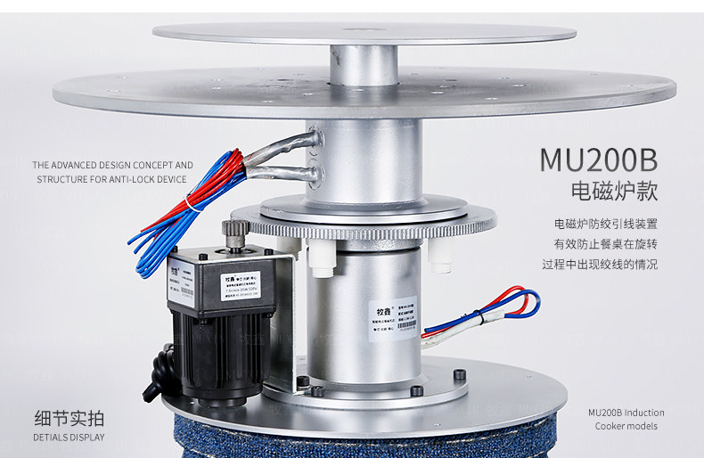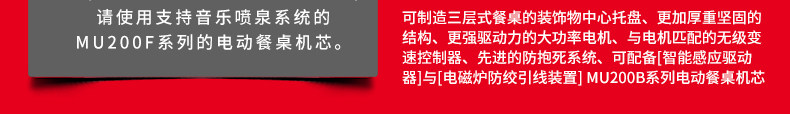 牧鑫MU200B系列电动餐桌机芯,适合制造餐桌中芯放置盆景或装饰物的电动餐桌。适用于2.0米至2.8米的电动餐桌(直径为1米至1.8米的转盘)。与A系列相比B系列使用了更厚更坚固的机身结构、更大的齿轮盘以及大功率可调速驱动电机。[中芯托盘]分两种设计,默认为[不随转型中芯托盘]其顶端装置了一个可放盆景与装饰物的托盘,并与中芯轴相连,利用中芯托盘下的螺纹使其固定在机芯顶部,此时中芯托盘不随转盘转动,[随转型中芯托盘]的装饰物可随着转盘一起转动,该型号适合生产:餐桌台面、转盘台面、装饰物台面组成的三层式电动餐桌。