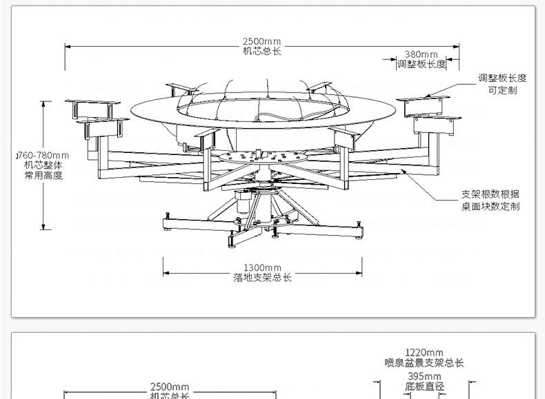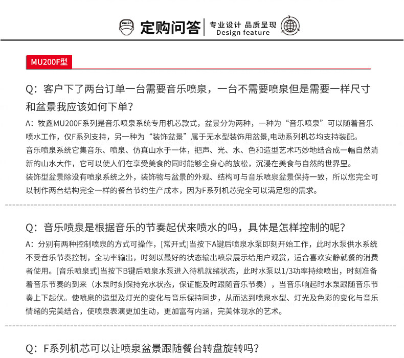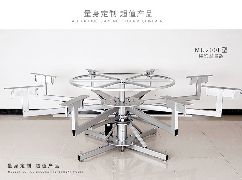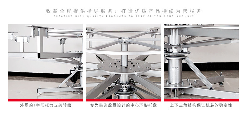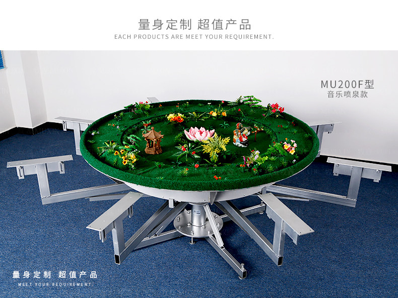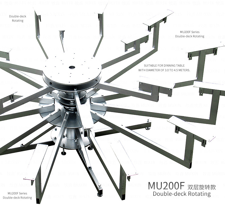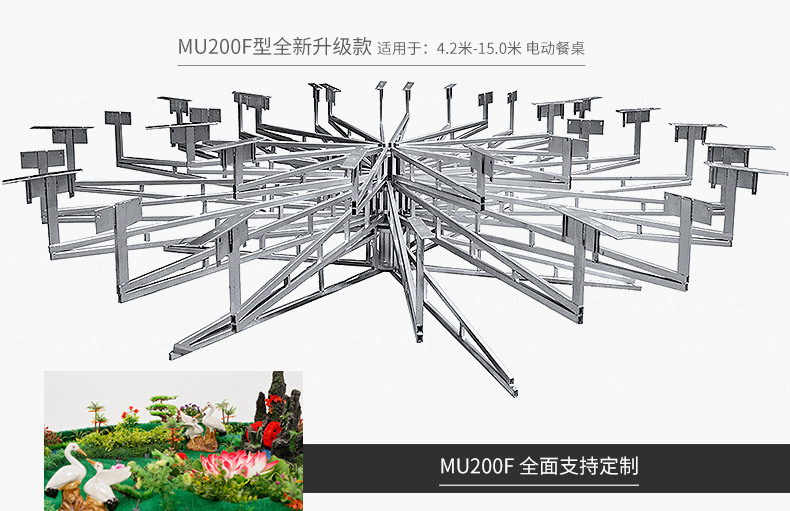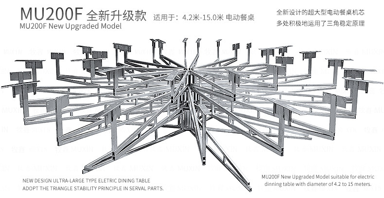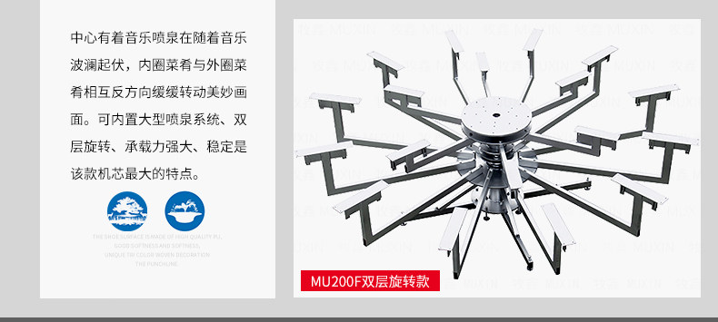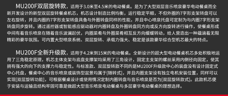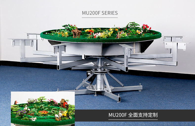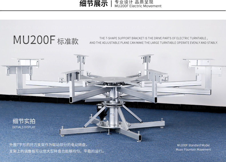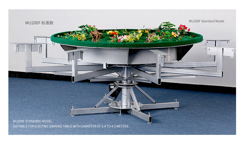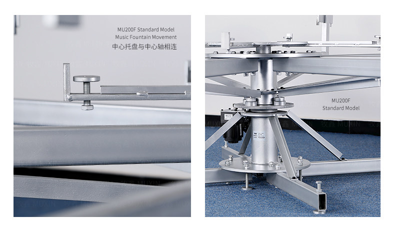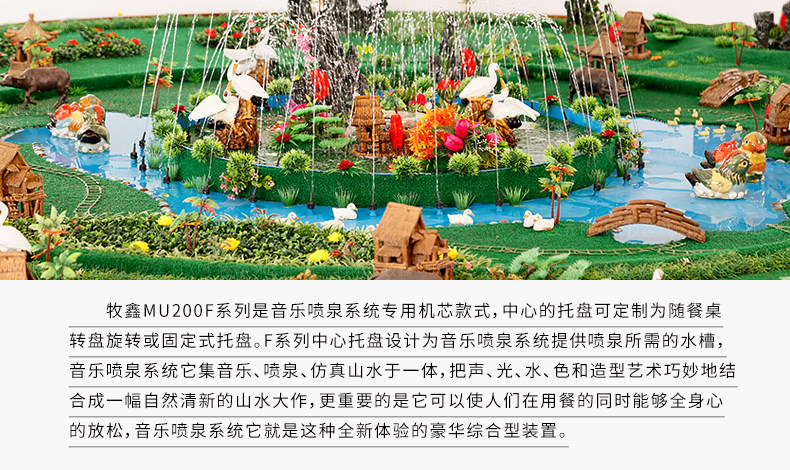 牧鑫MU200F系列是专为音乐喷泉系统而开发的机芯款式,适用于2.4米至15米的电动餐桌(直径为1.4米至14米的转盘)。 外圈7字形的托力支架作为驱动部分的电动转盘,主体支架与底盘支撑架均采用了三角设计,固定主支架的螺丝采用内侧径向固定,为支撑喷泉水箱提供强大的向下支撑力与稳定性。 音乐喷泉系统集音乐、喷泉、仿真山水于一体,把声、光、水、色和造型艺术巧妙地结合成一幅自然清新的山水大作。随着音乐喷泉波澜起伏,用户在享受美食的同时能够全身心的放松,沉浸在自然与美食的世界之中。高山流水、轻歌起舞,和谐的气氛,全新的体验,MU200F系列音乐喷泉专用机芯,只为谈笑间为您带来更多商机。