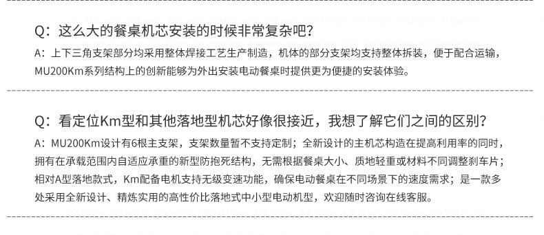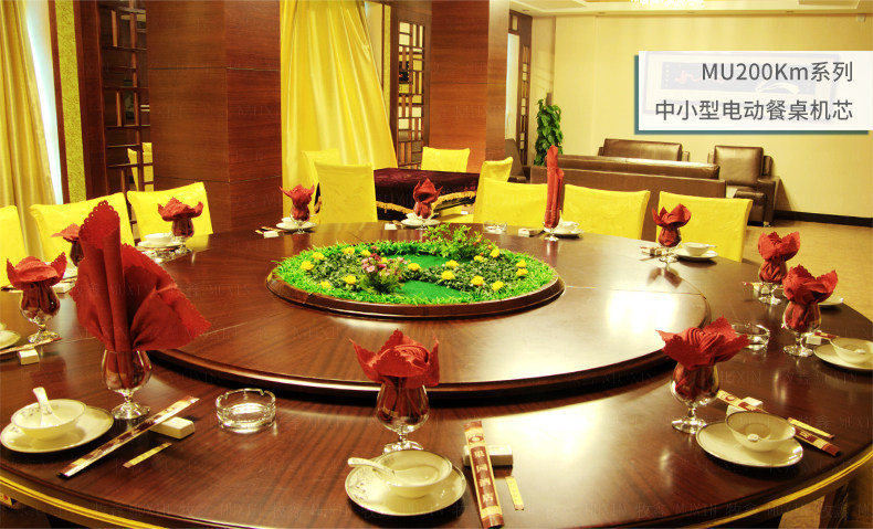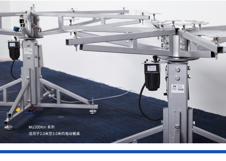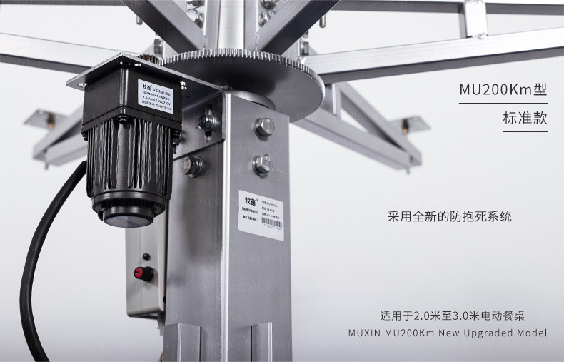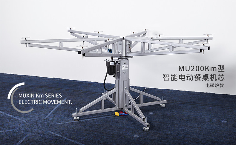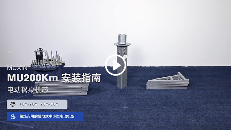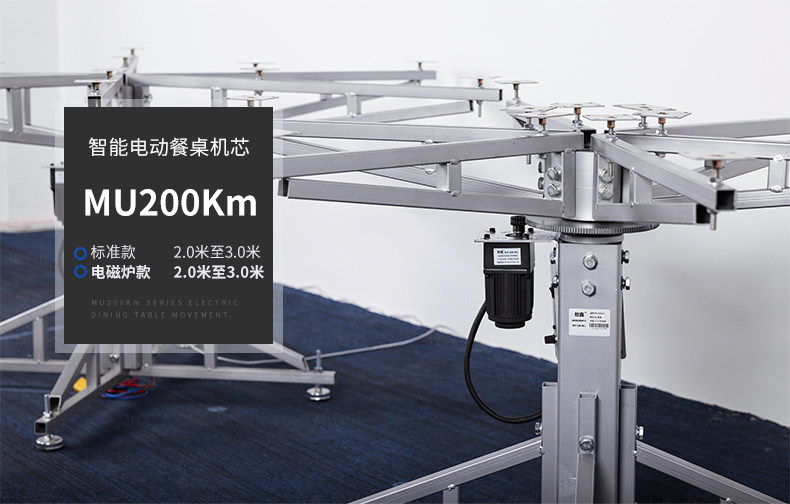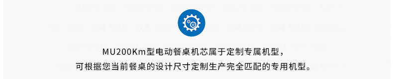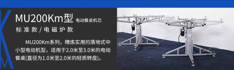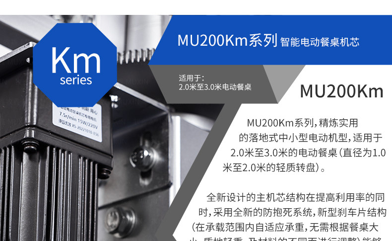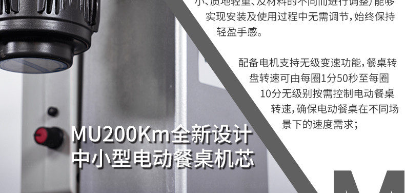 MU200Km系列,精炼实用的落地式中小型电动机型,适用于2.0米至3.0米的电动餐桌(直径为1.0米至2.0米的轻质转盘)。全新设计的主机芯结构在提高利用率的同时,采用全新的防抱死系统,能够实现安装及使用过程中无需调节,始终保持轻盈手感。新型电机支架的固定方式更加简单,利于齿轮间的啮合调整、降低电机噪音及延长电机寿命。同时,改进后的台面调整板与调节脚垫,上下高度可更直观的调节固定,有效提高不同使用场景的适应程度,配合上下三角主支架,进一步便于机芯的运输与安装工作。MU200Km,一款多处采用全新设计、精炼实用的高性价比落地式中小型电动机型。