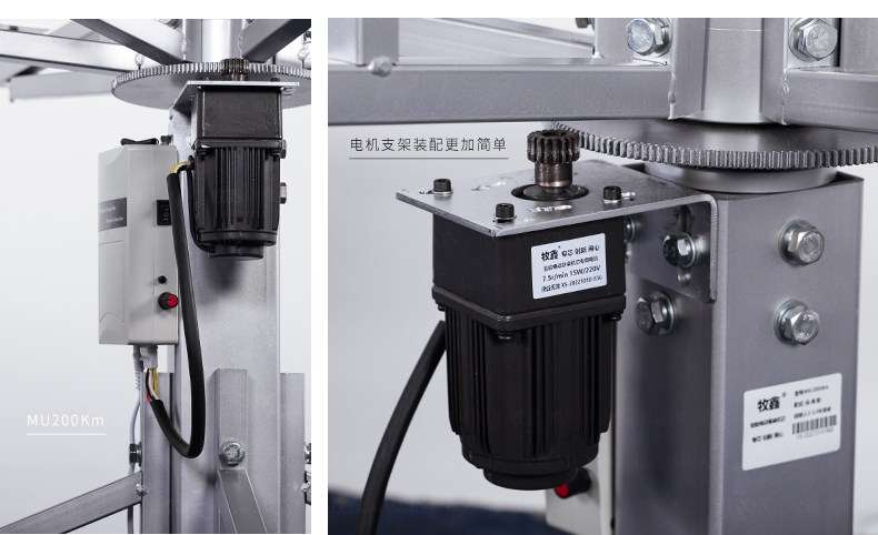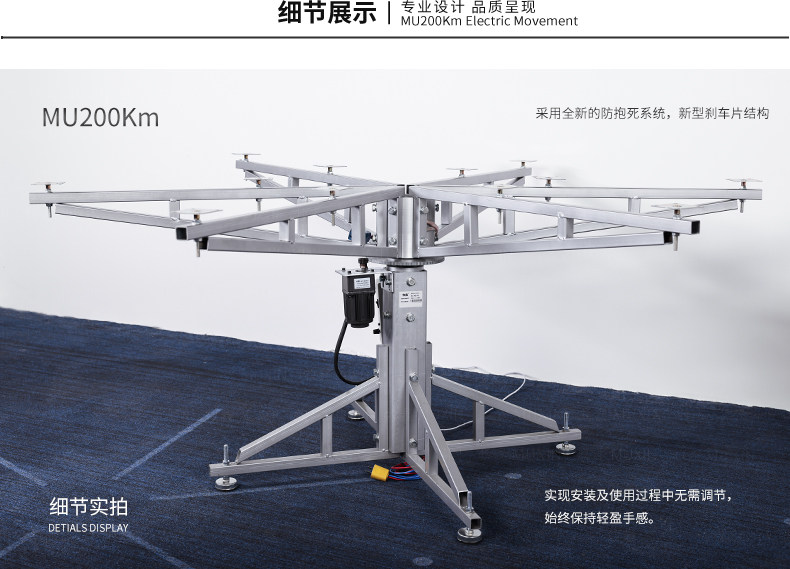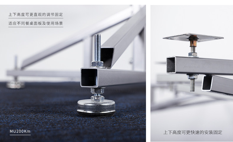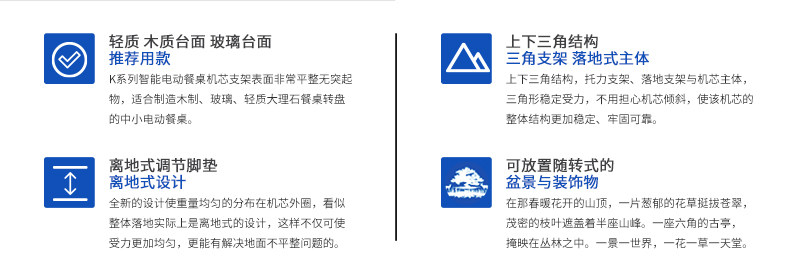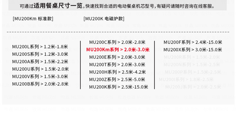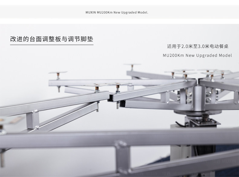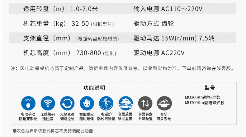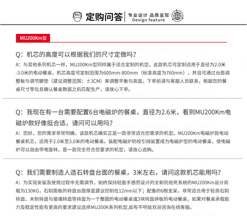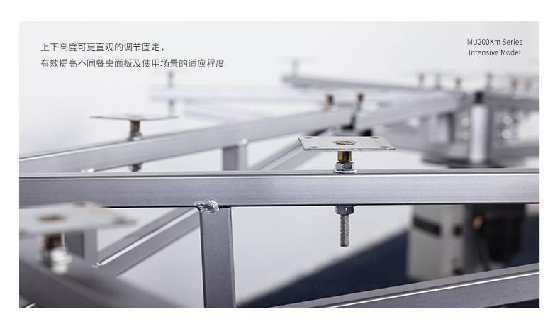 MU200Km系列,精炼实用的落地式中小型电动机型,适用于2.0米至3.0米的电动餐桌(直径为1.0米至2.0米的轻质转盘)。全新设计的主机芯结构在提高利用率的同时,采用全新的防抱死系统,能够实现安装及使用过程中无需调节,始终保持轻盈手感。新型电机支架的固定方式更加简单,利于齿轮间的啮合调整、降低电机噪音及延长电机寿命。同时,改进后的台面调整板与调节脚垫,上下高度可更直观的调节固定,有效提高不同使用场景的适应程度,配合上下三角主支架,进一步便于机芯的运输与安装工作。MU200Km,一款多处采用全新设计、精炼实用的高性价比落地式中小型电动机型。