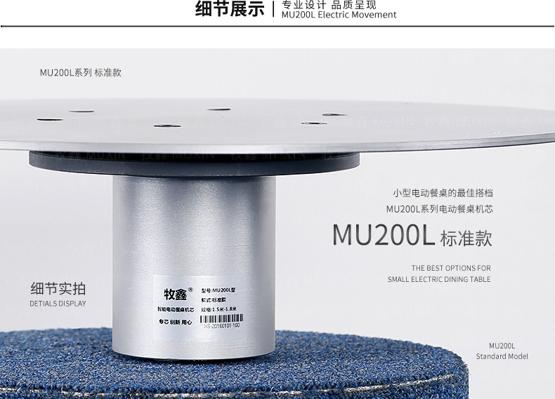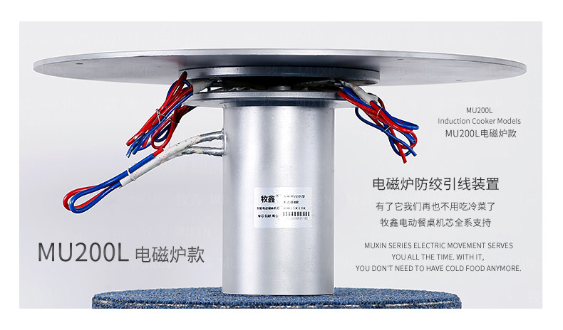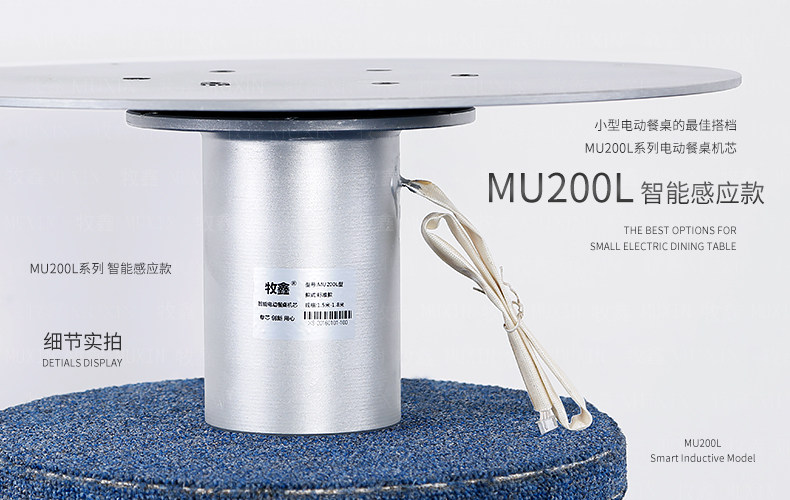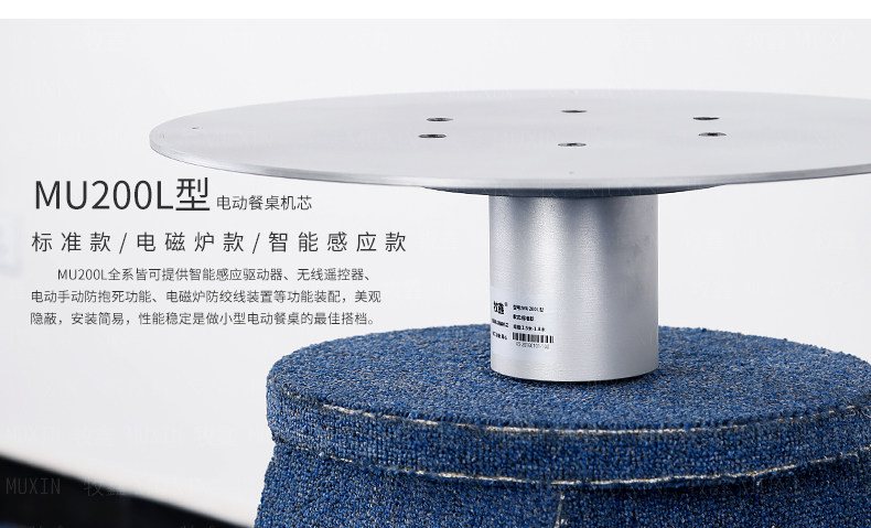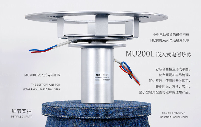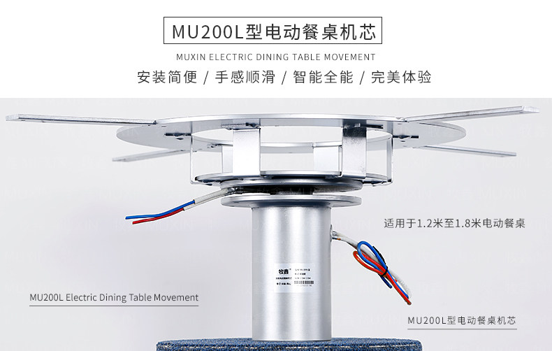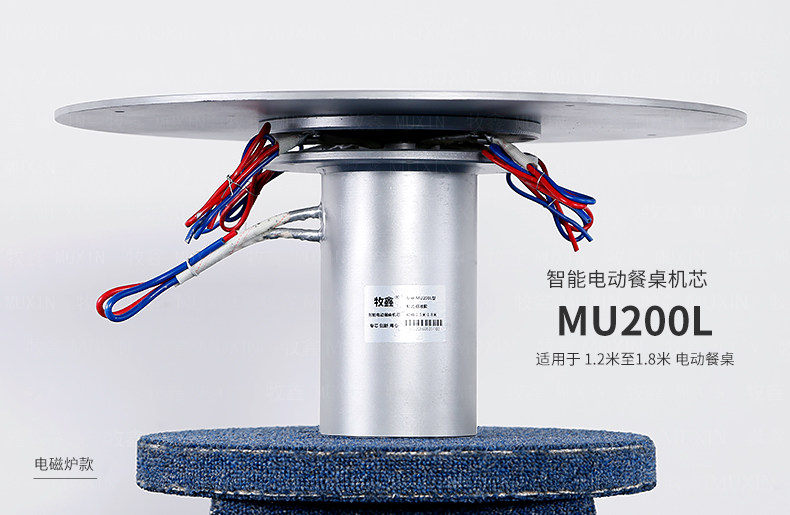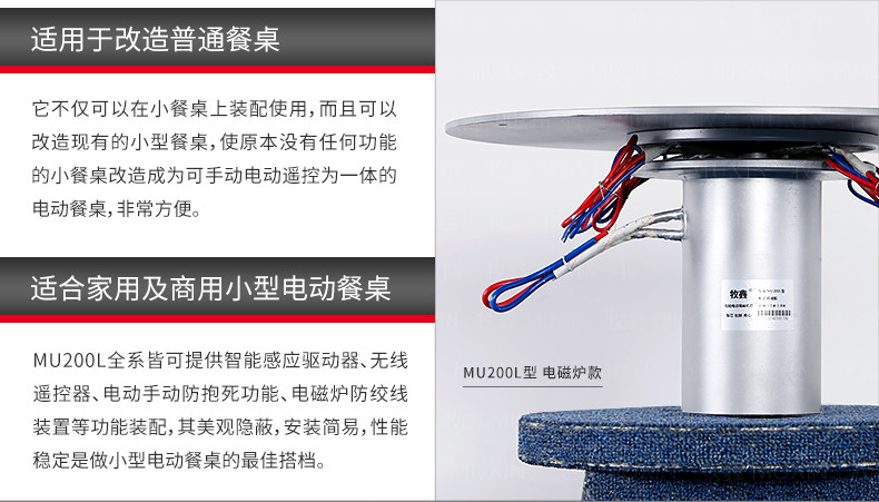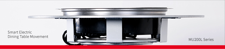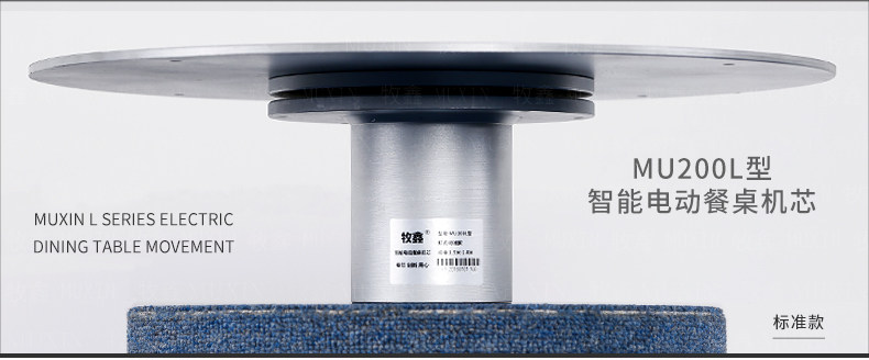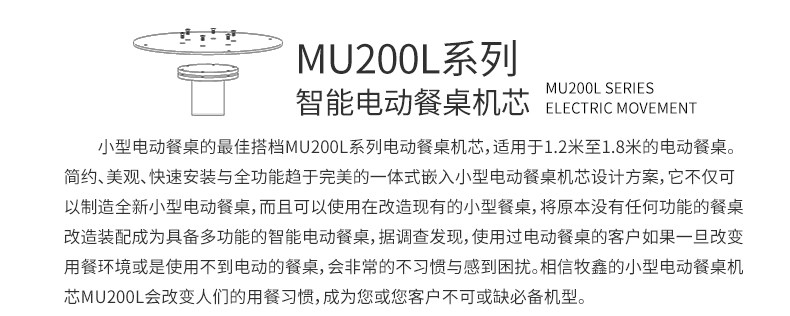 小型电动餐桌的理想机型MU200L系列电动餐桌机芯,适用于1.2米至1.8米的电动餐桌(直径为0.5米至1.0米的转盘)。是一款集简约、美观、安装便捷、全功能的一体嵌入式小型机芯设计方案,它不仅用于制造全新小型电动餐桌,且适合改造现有成品的小型餐桌,将普通餐桌改造装配成为具备多功能的智能电动餐桌。 MU200L全系支持电动、手动、防抱死、左右旋转、电磁炉防绞引线装置、无线遥控驱动、智能感应驱动等功能,造型经典美观、安装简易、性能稳定,相信MU200L小型电动餐桌机芯会慢慢改变人们的用餐习惯,成为您或客户不可或缺的机型。