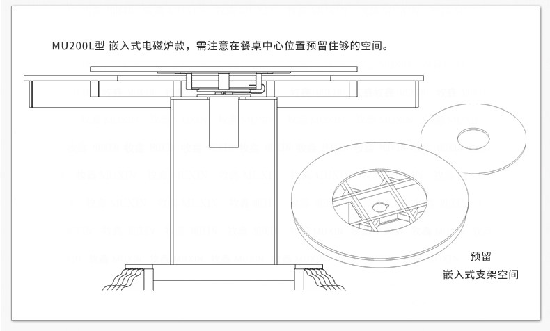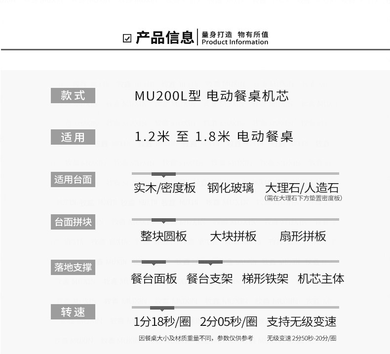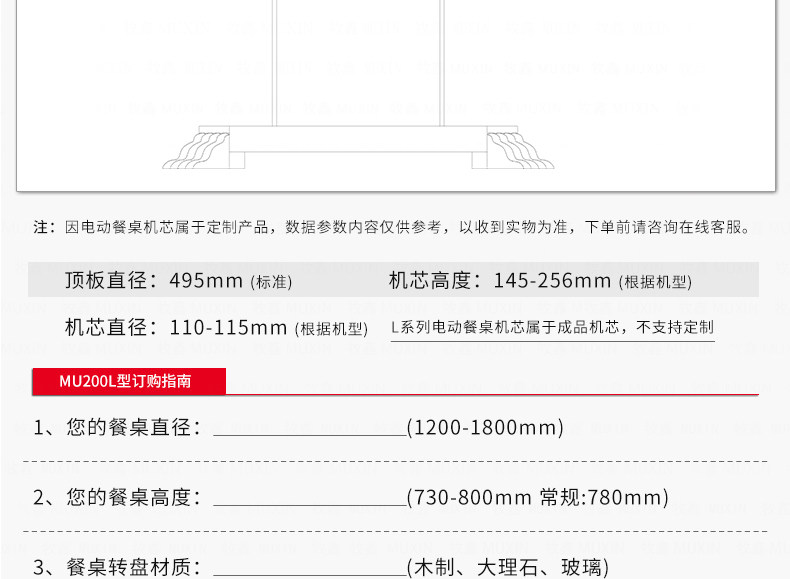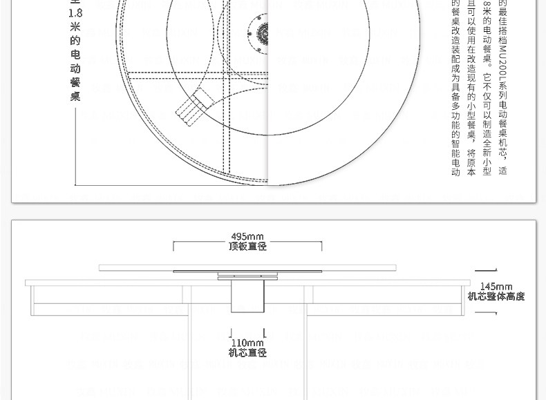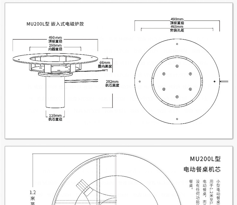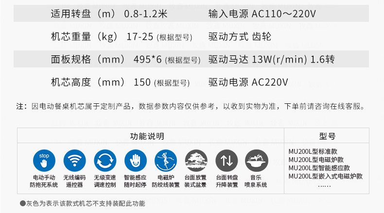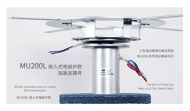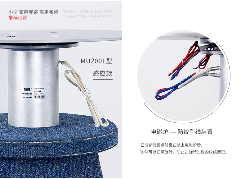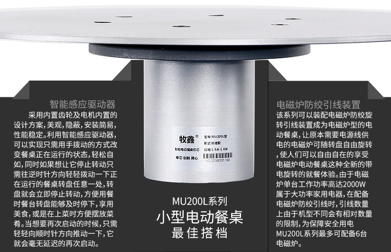 小型电动餐桌的理想机型MU200L系列电动餐桌机芯,适用于1.2米至1.8米的电动餐桌(直径为0.5米至1.0米的转盘)。是一款集简约、美观、安装便捷、全功能的一体嵌入式小型机芯设计方案,它不仅用于制造全新小型电动餐桌,且适合改造现有成品的小型餐桌,将普通餐桌改造装配成为具备多功能的智能电动餐桌。 MU200L全系支持电动、手动、防抱死、左右旋转、电磁炉防绞引线装置、无线遥控驱动、智能感应驱动等功能,造型经典美观、安装简易、性能稳定,相信MU200L小型电动餐桌机芯会慢慢改变人们的用餐习惯,成为您或客户不可或缺的机型。