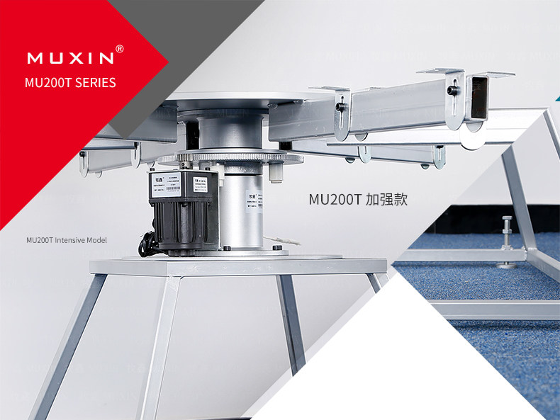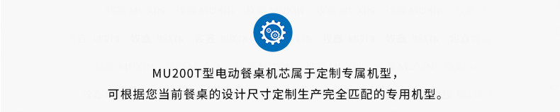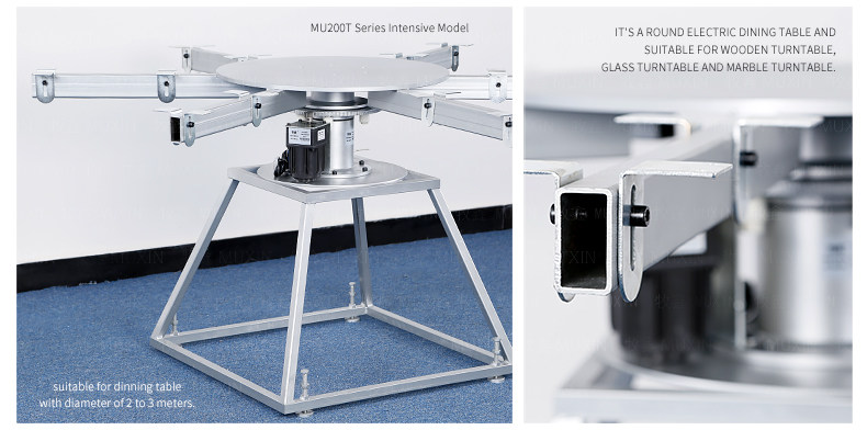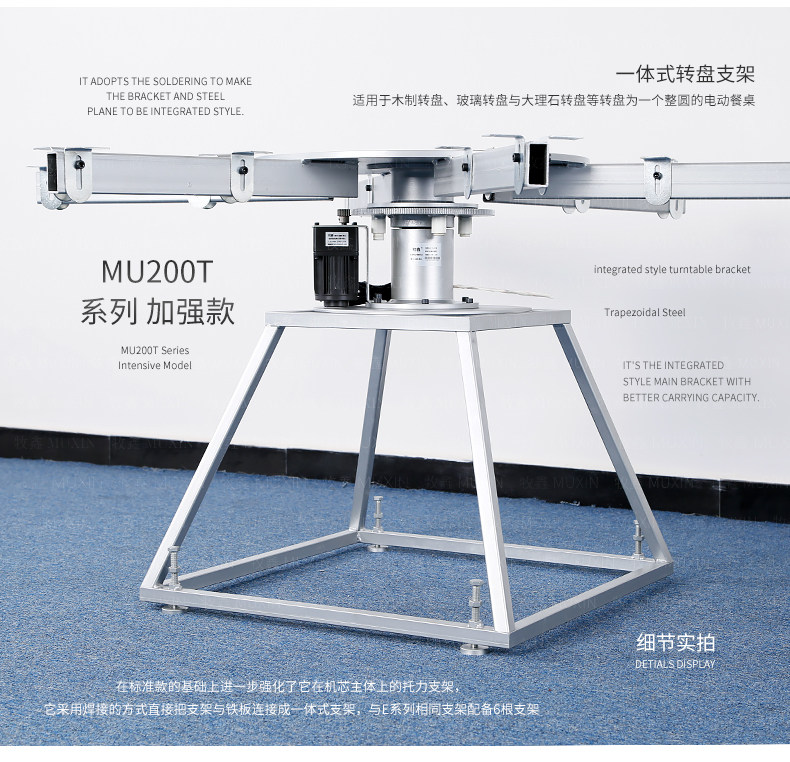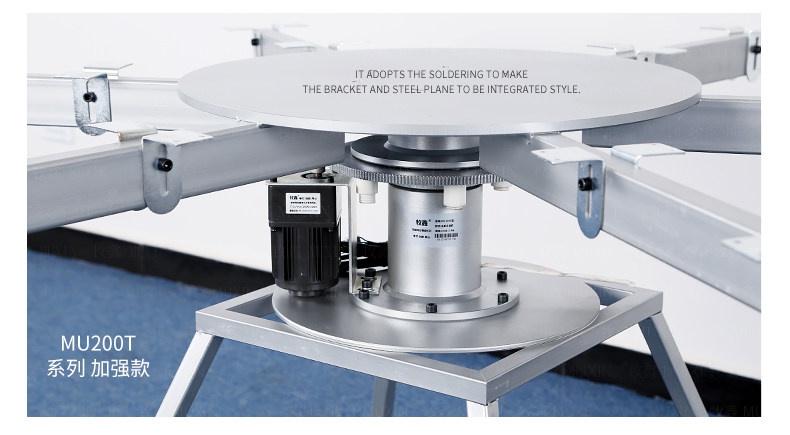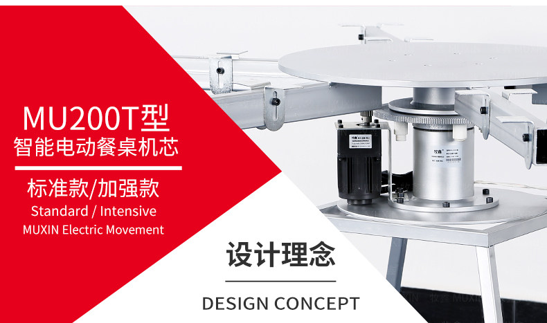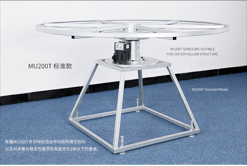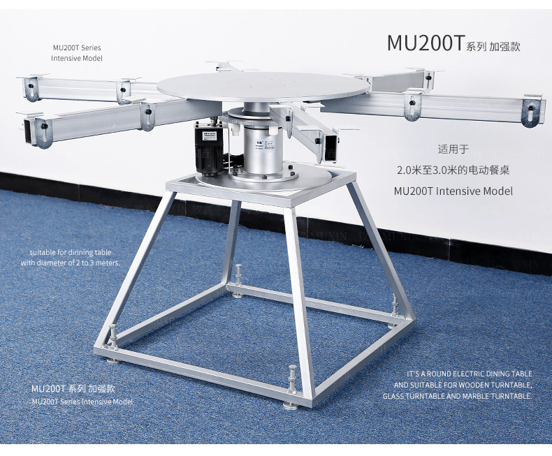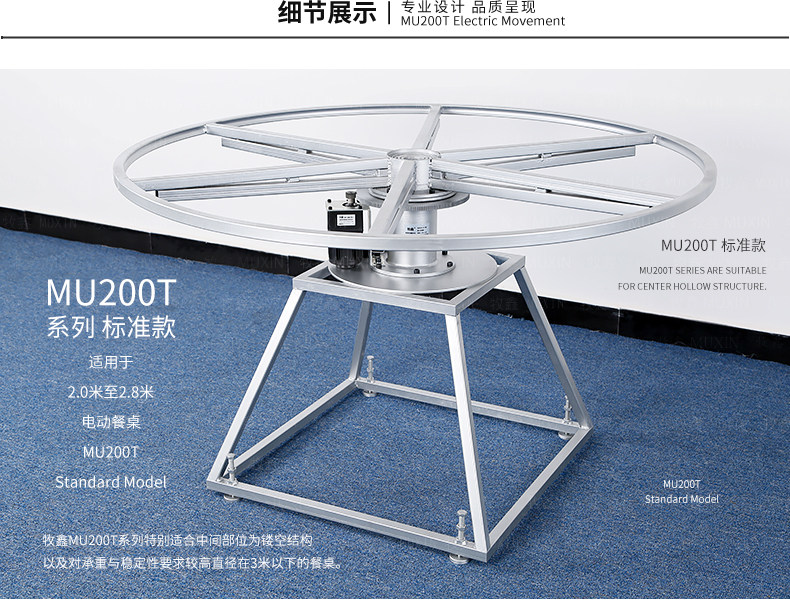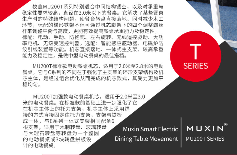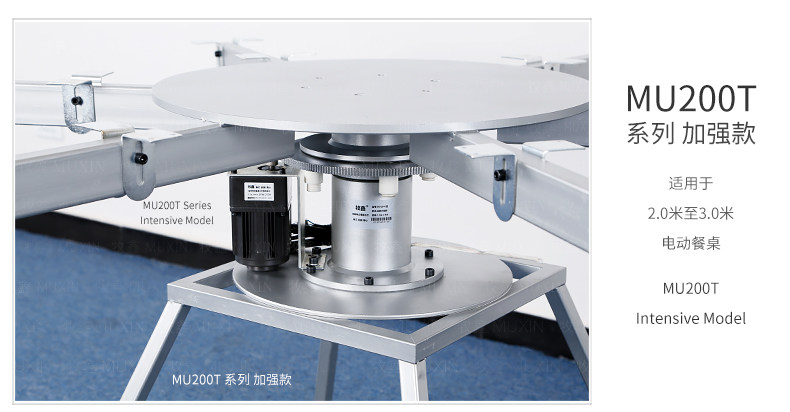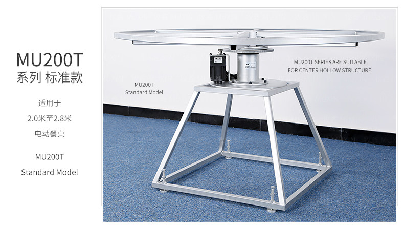 牧鑫MU200T系列电动餐桌机芯特别适合中间结构镂空,以及对承重与稳定性要求较高,餐桌直径在3.0米以下(0.7米至2.0米的转盘)。它针对某些餐桌生产时的特殊结构问题,使餐台转盘直接落地、减少木工环节,同时有效提高餐桌承重能力及稳定性。 标准款与C系列的不同在于强化了主支架的环形支架及机芯主体结构,是经过组合优化的机芯款式,受力平稳均匀;加强款在标准款的基础上强化了它在机芯主体上的托力支架,与E系列一体式支架相同配备6根支架,适用转盘设计为多块拼板的电动餐桌。 MU200T系列,机芯主体直接落地、一体式主支架、较高承重能力及稳定性,是中型电动餐桌的理想落地型机型。