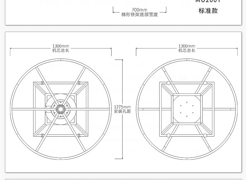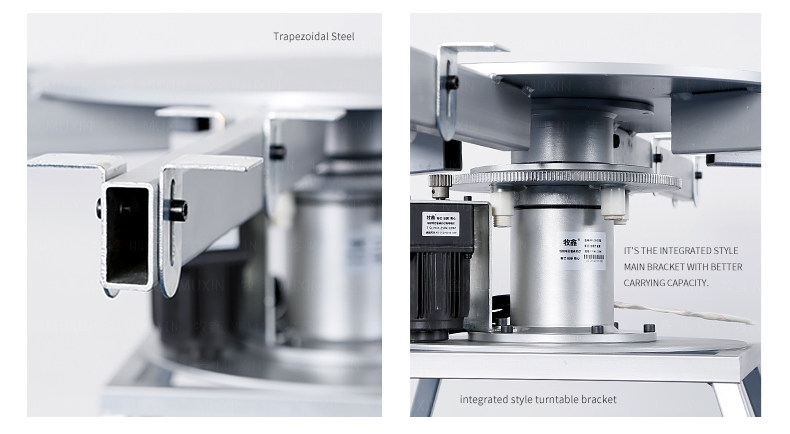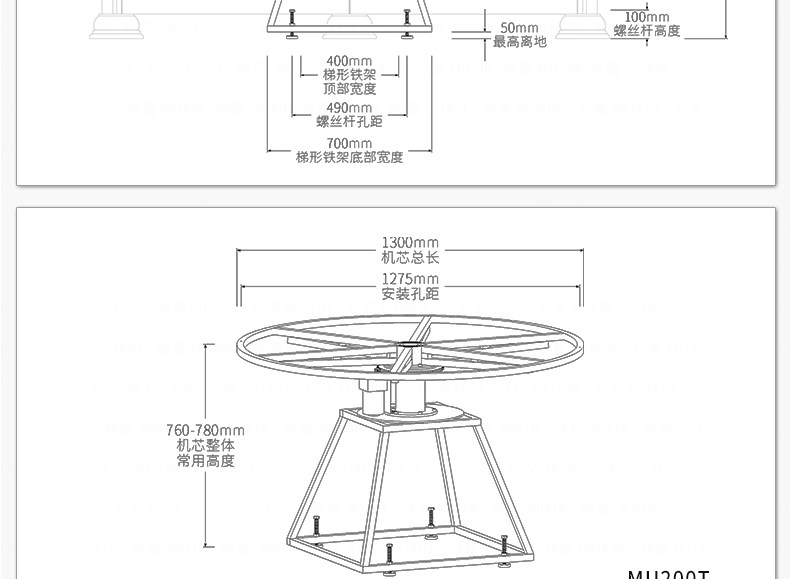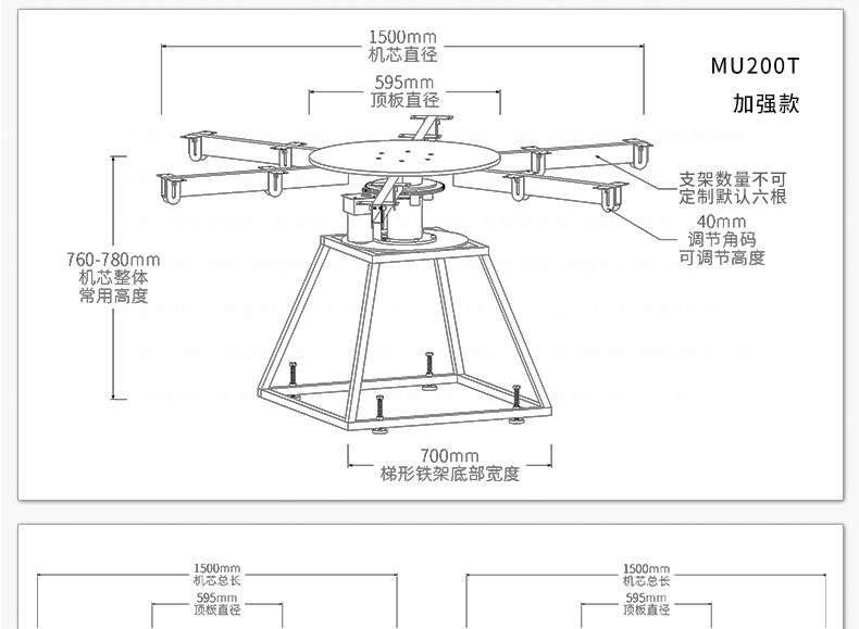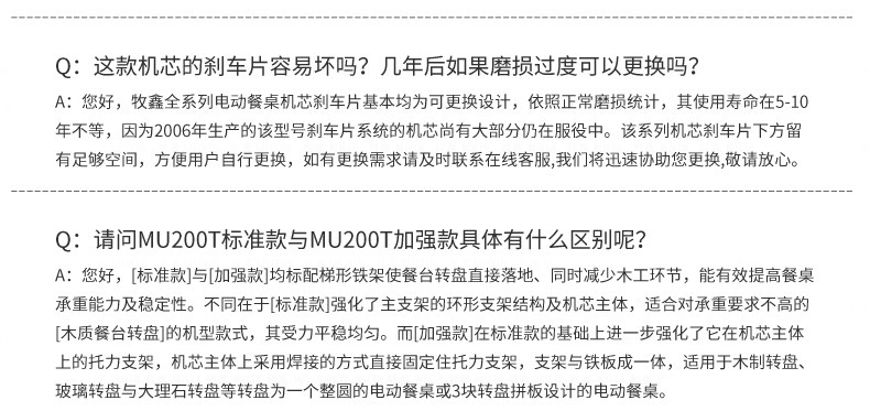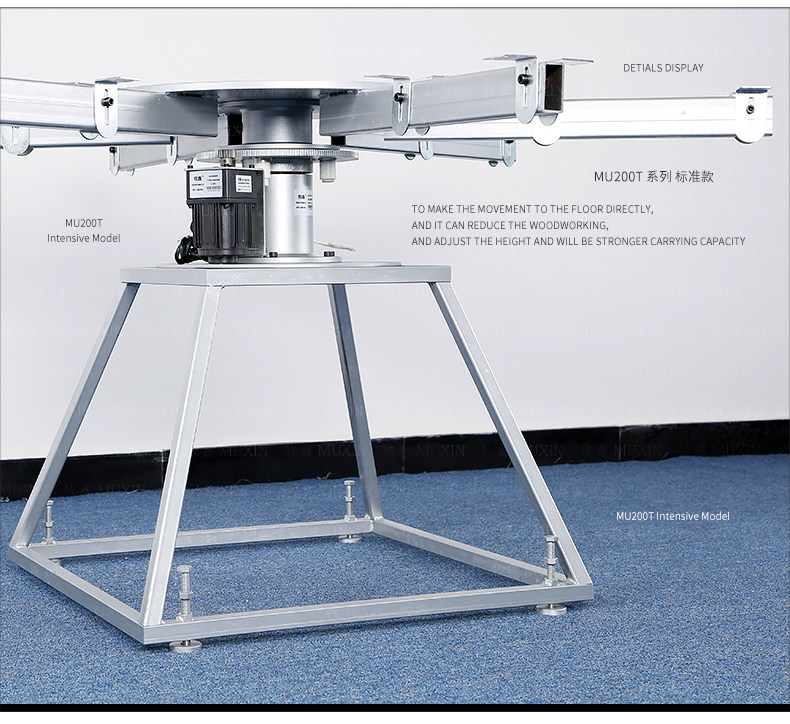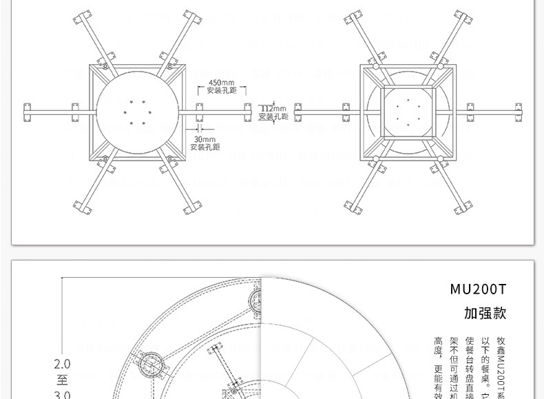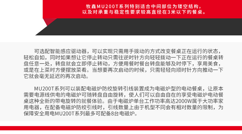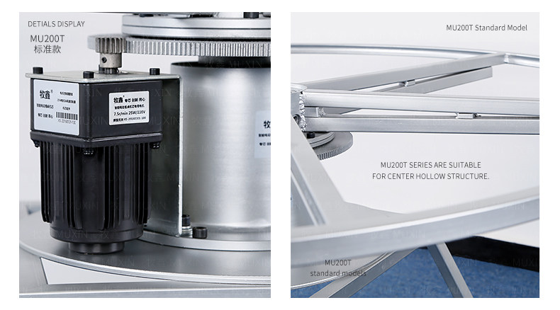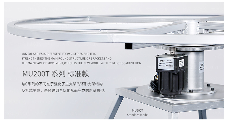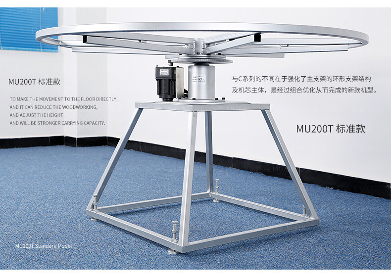 牧鑫MU200T系列电动餐桌机芯特别适合中间结构镂空,以及对承重与稳定性要求较高,餐桌直径在3.0米以下(0.7米至2.0米的转盘)。它针对某些餐桌生产时的特殊结构问题,使餐台转盘直接落地、减少木工环节,同时有效提高餐桌承重能力及稳定性。 标准款与C系列的不同在于强化了主支架的环形支架及机芯主体结构,是经过组合优化的机芯款式,受力平稳均匀;加强款在标准款的基础上强化了它在机芯主体上的托力支架,与E系列一体式支架相同配备6根支架,适用转盘设计为多块拼板的电动餐桌。 MU200T系列,机芯主体直接落地、一体式主支架、较高承重能力及稳定性,是中型电动餐桌的理想落地型机型。